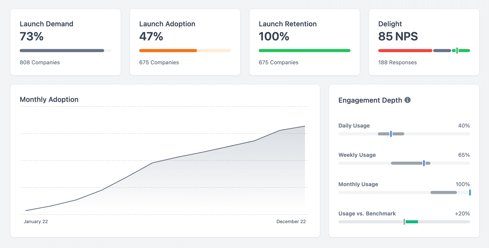Benchmarked reporting across all initiatives and products measuring adoption and delight.